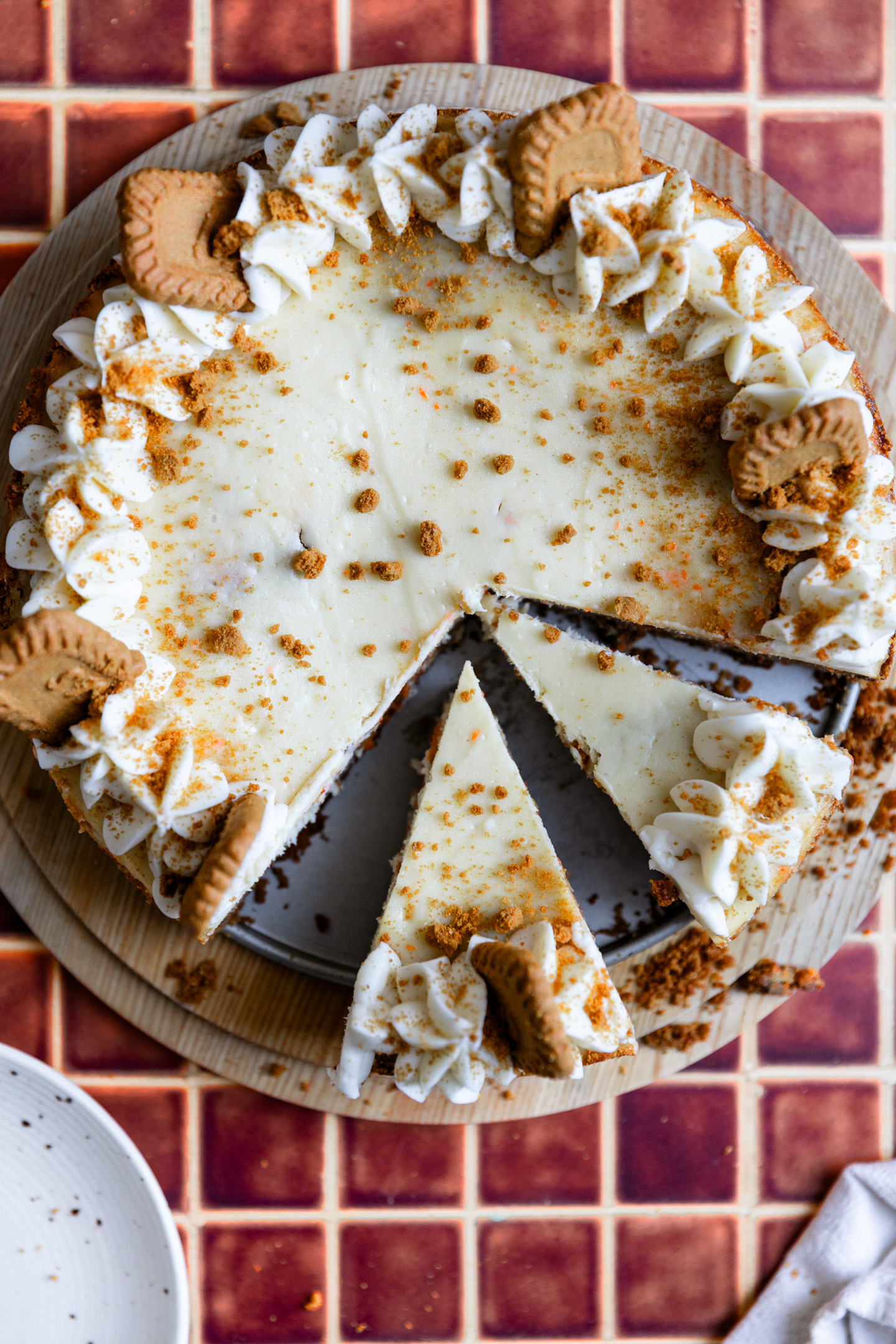 Oh and the best part- it has a cookie butter crust! I absolutely am obsessed (as a human and as a trained pastry chef) with cookie butter so instead of the classic graham cracker crumbs, I crushed up Lotus cookies and made it into the crust. It gives the cake an extra layer of flavor and goes so incredibly well with the warm spiced carrot cake.