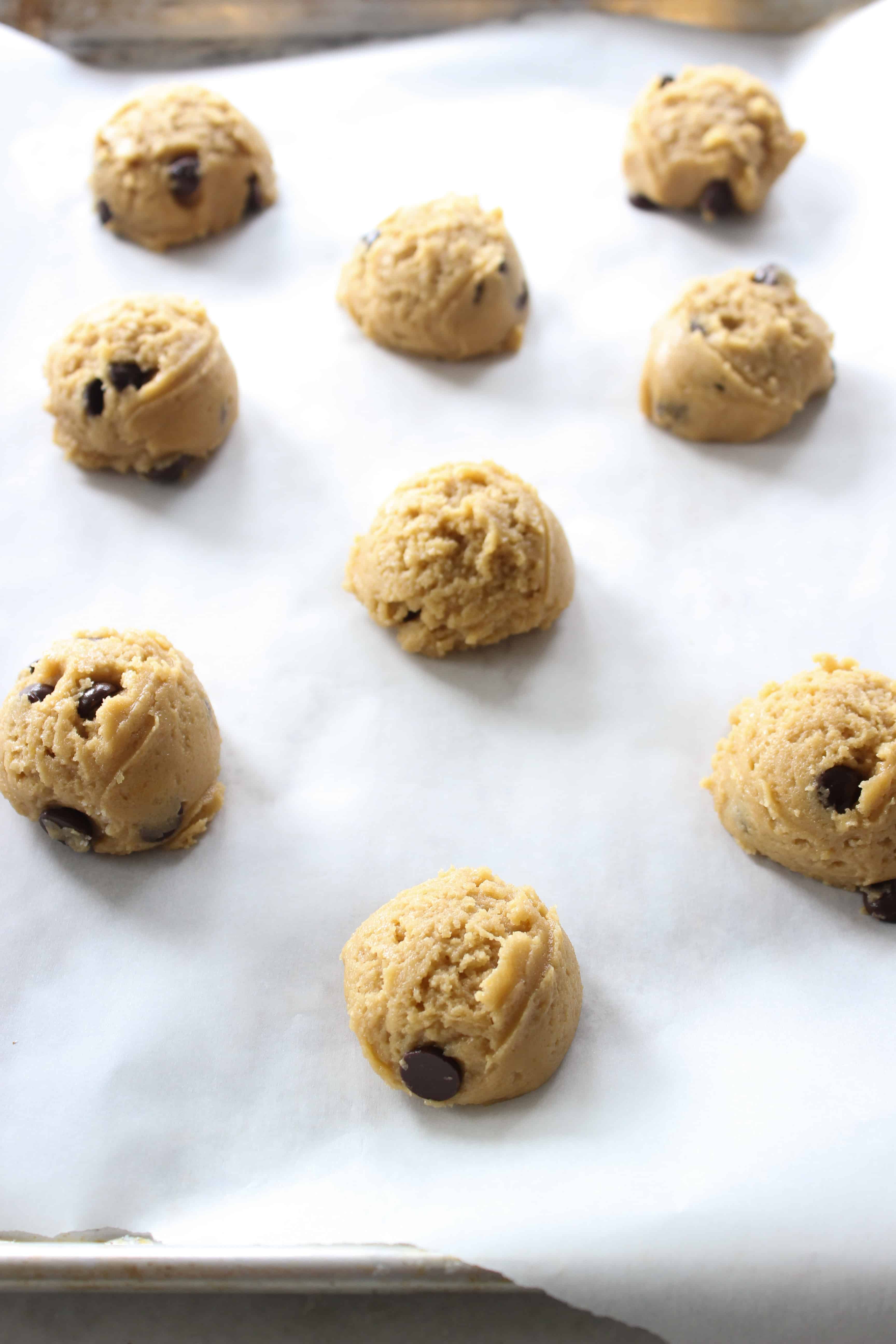 Once the cookie dough is made, form balls with your hands or a small ice cream scoop and bake on a parchment paper-lined baking tray until the edges of the cookies are golden.