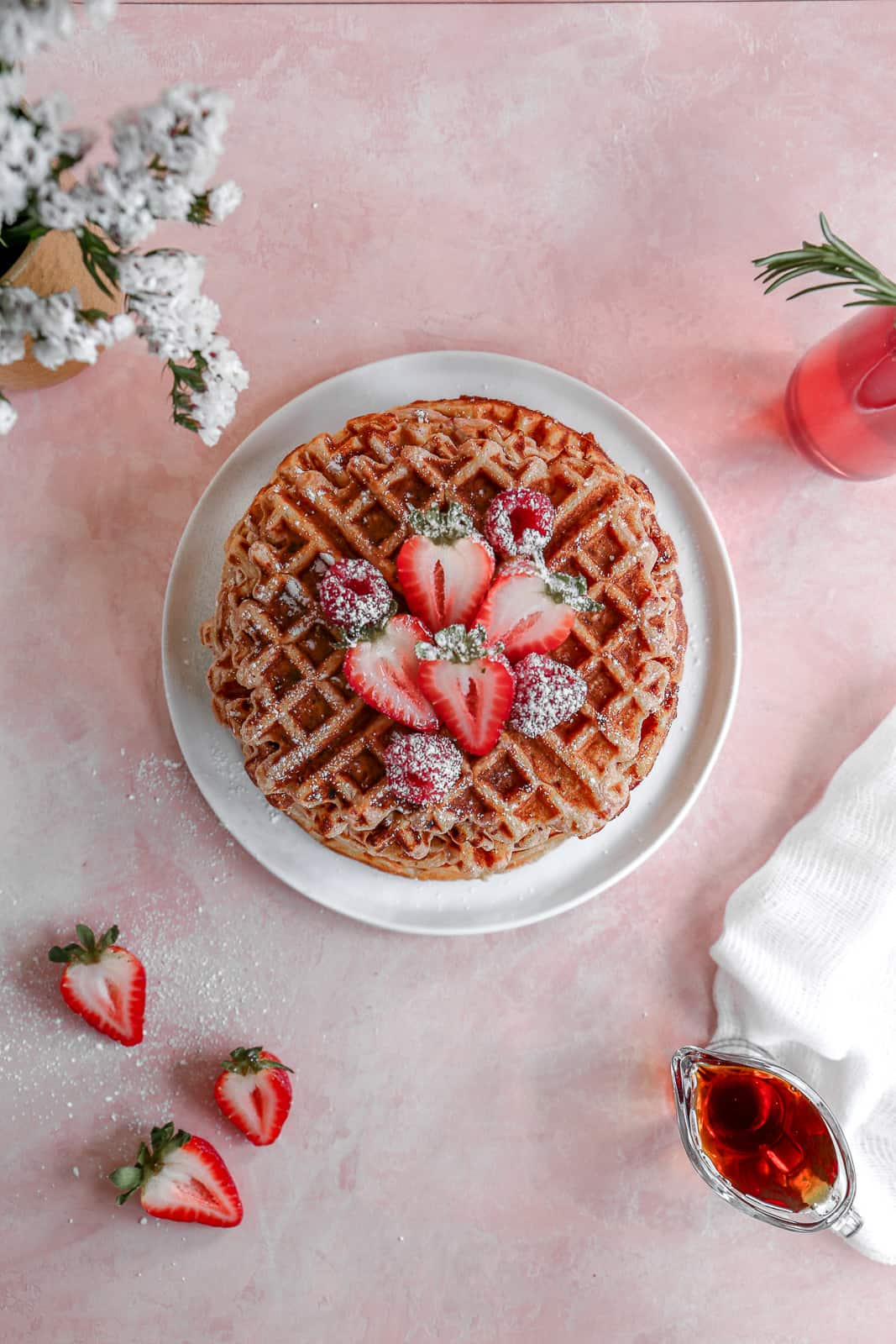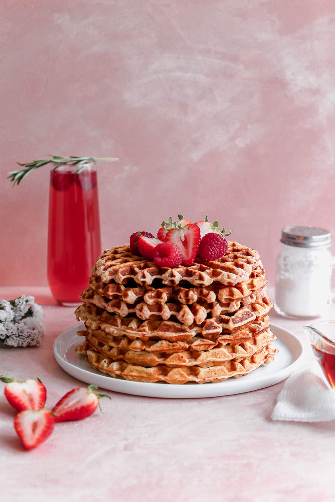 Now lets talk about flavor. These are like strawberries waffles to the max. Theres strawberry in the dry ingredients and strawberry in the wet ingredients which equals strawberry waffle heaven! Pair it with some maple syrup, confectioners sugar, or you guessed it- strawberries on top and you’ve got a beautiful breakfast to present to mama.