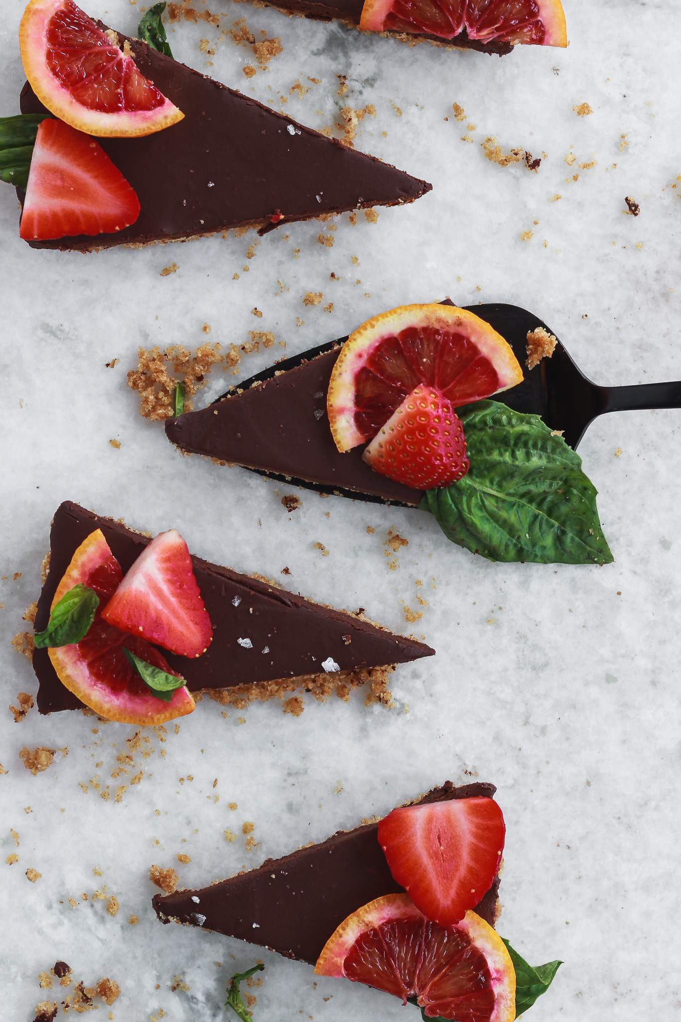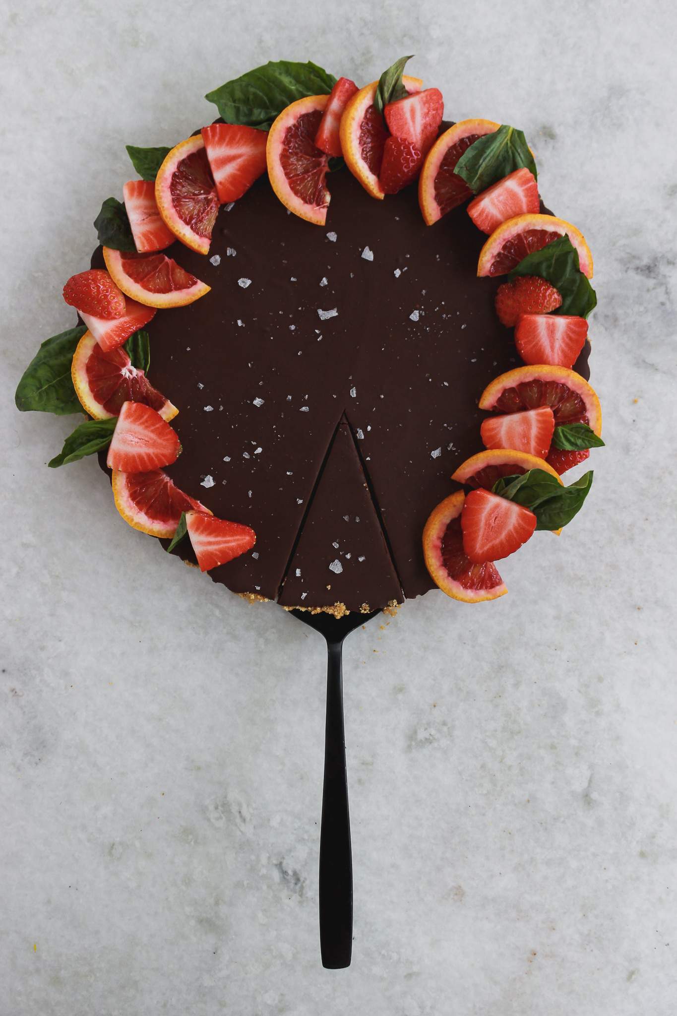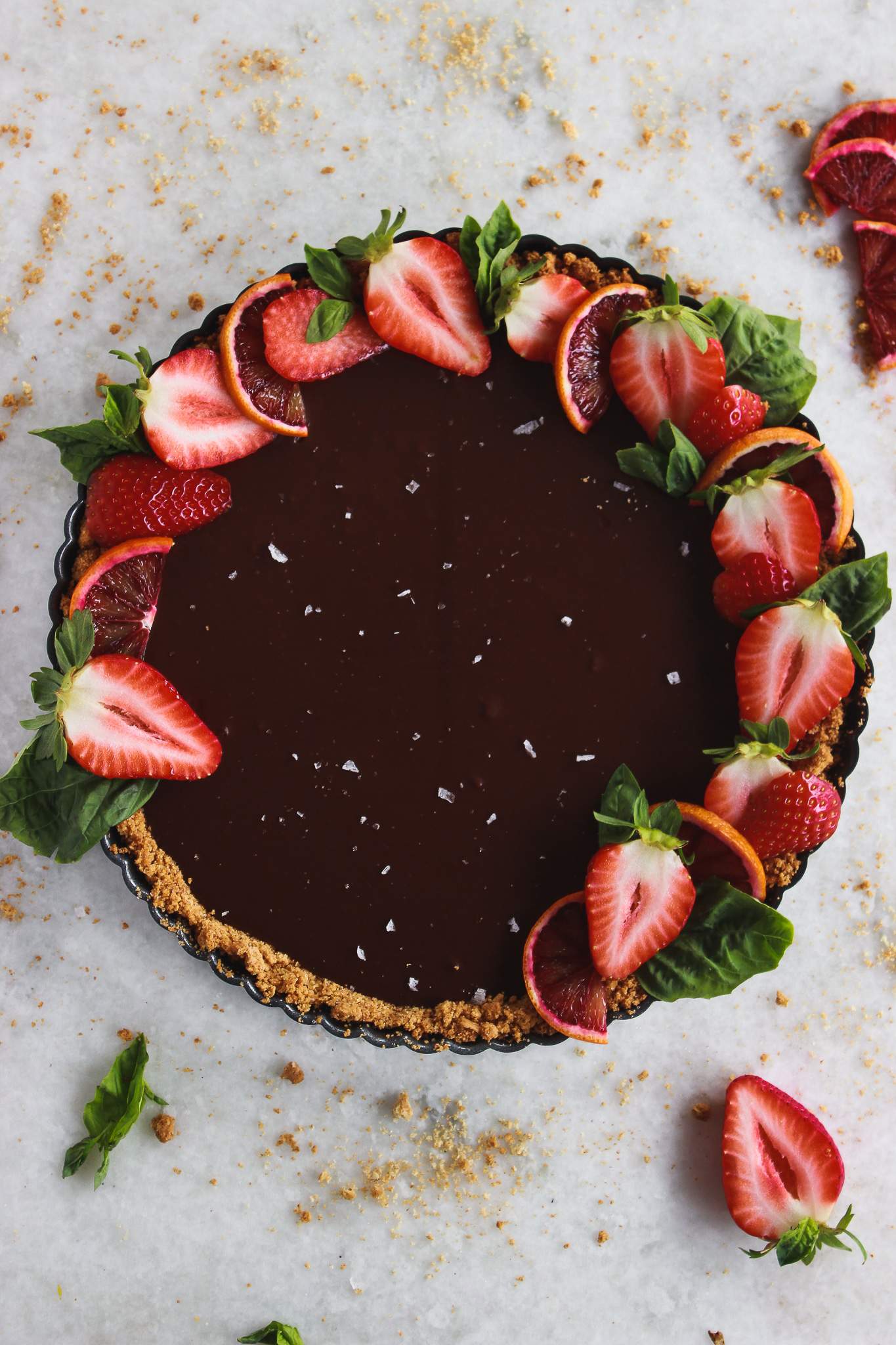 - After about 10 minutes when the ganache has thickened, pour it into the graham cracker crust and place it in the fridge to thicken some more. After 20 mins you can then garnish with sliced fruit and sea salt.