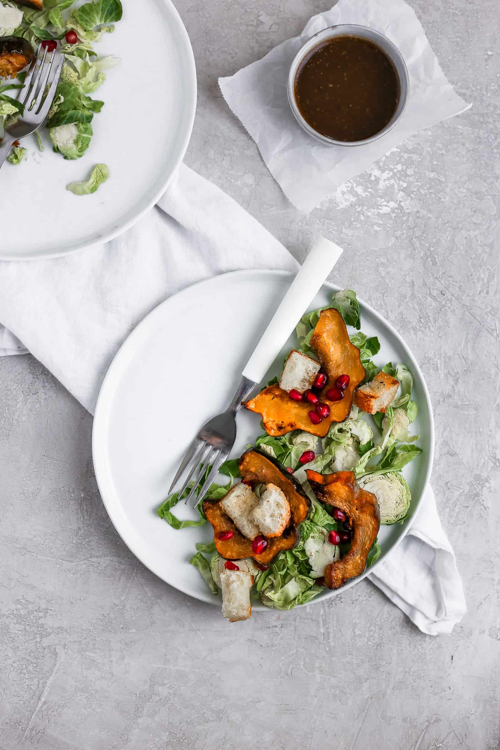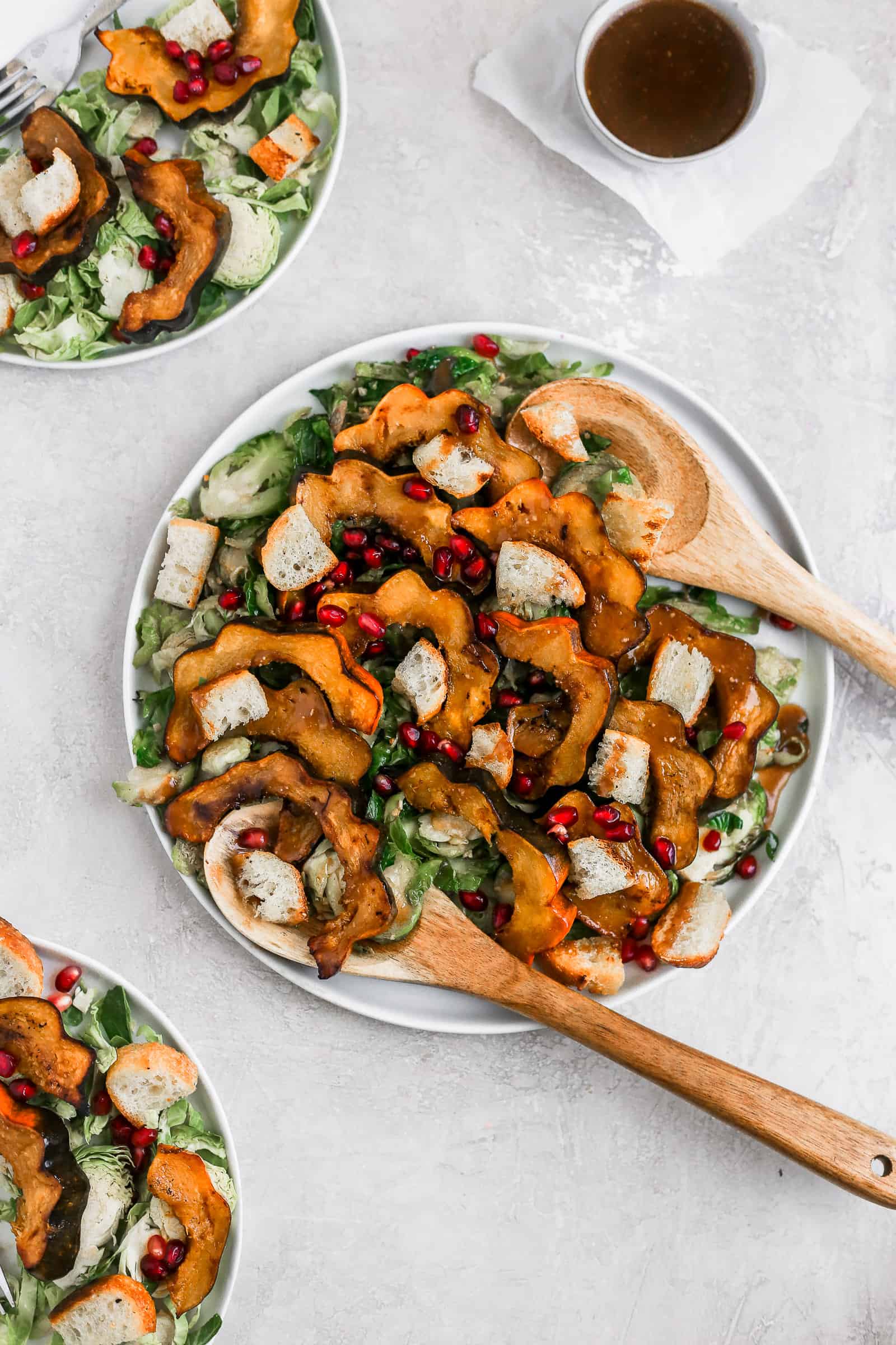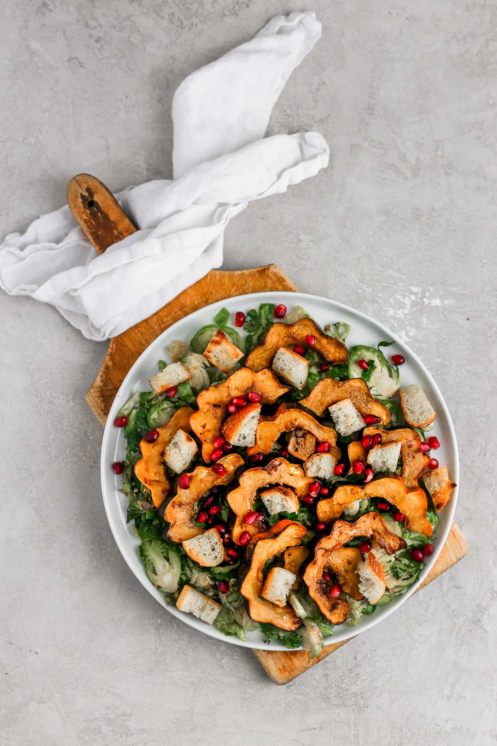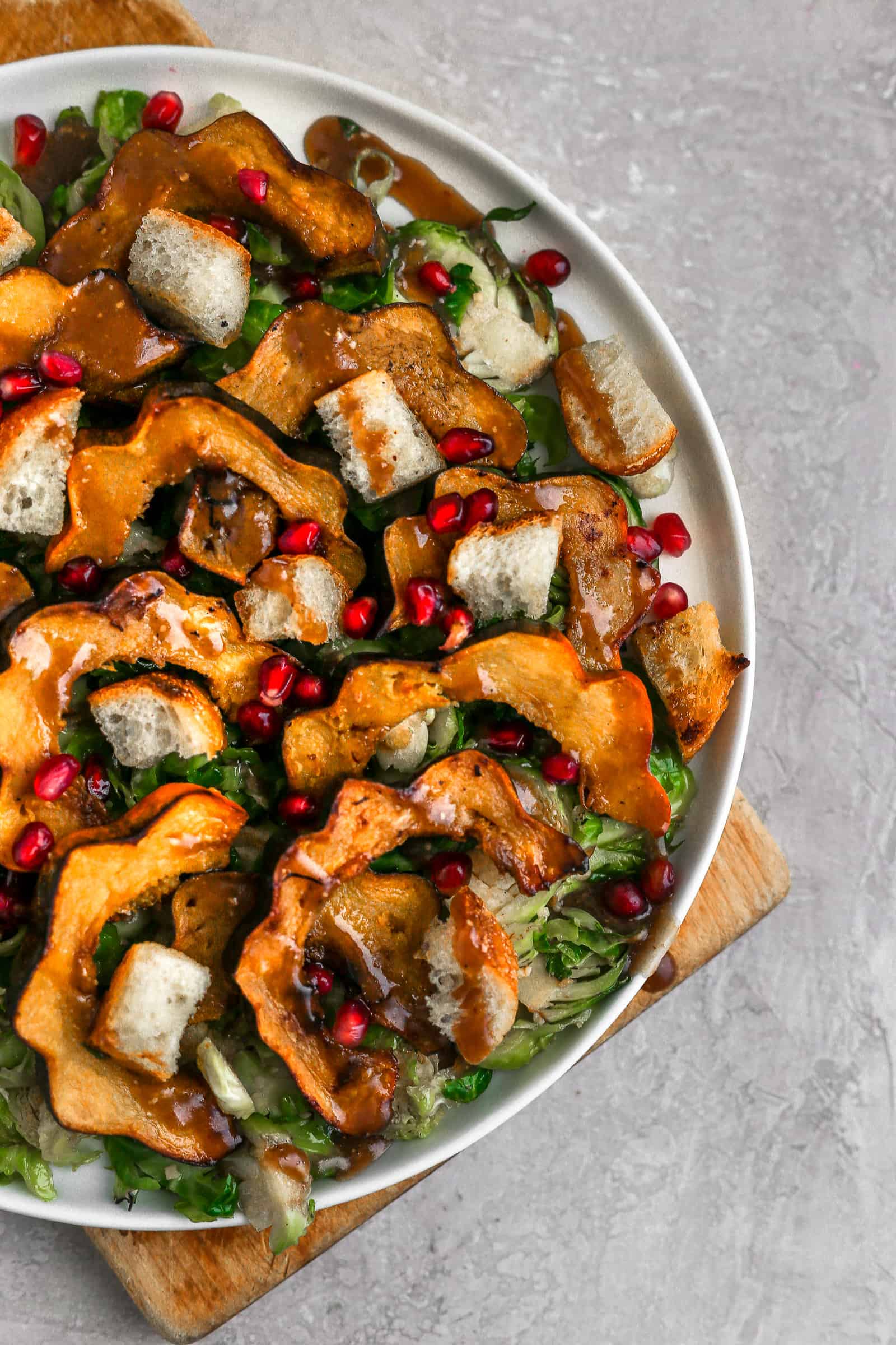 - Assemble the salad- Lay the brussels sprouts on a platter, with the acorn squash and bread cubes on top. Sprinkle with the pomegranate seeds and drizzle with the dressing.