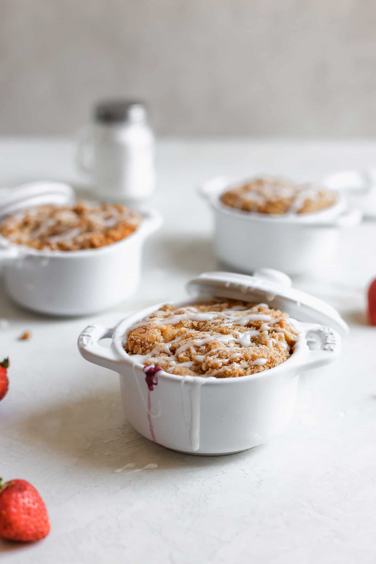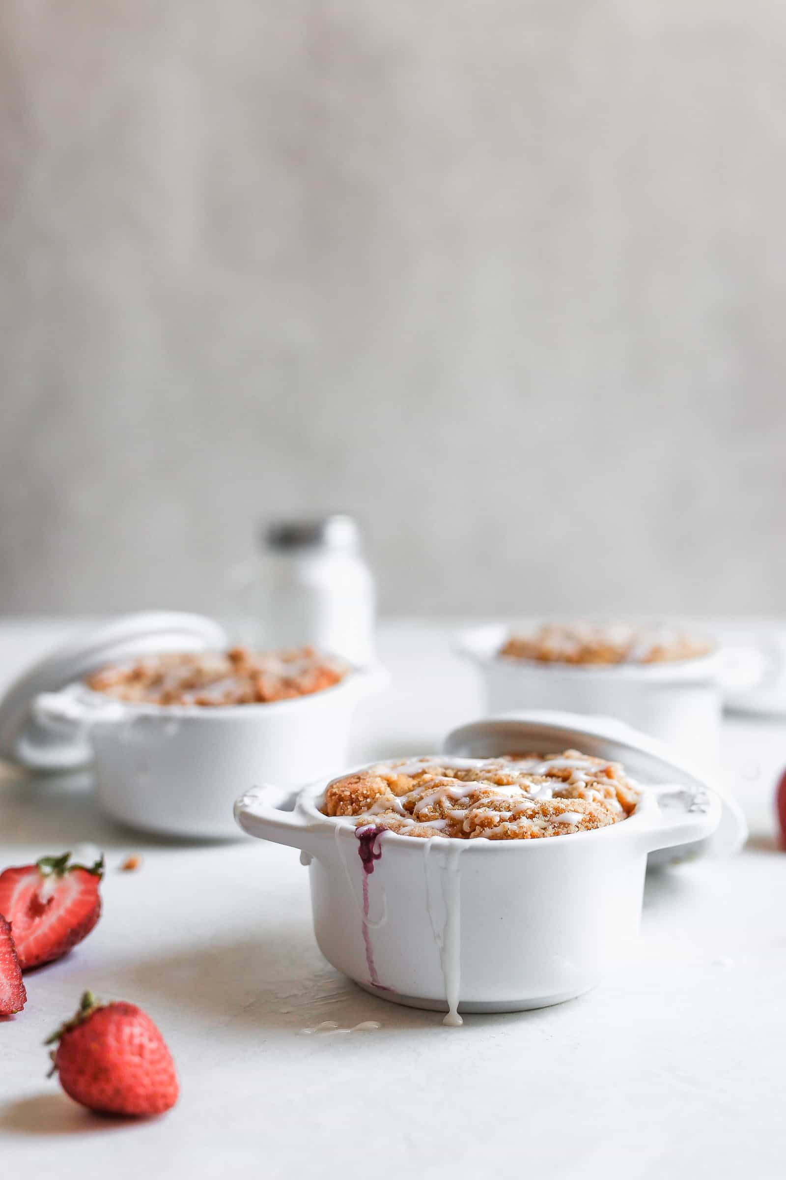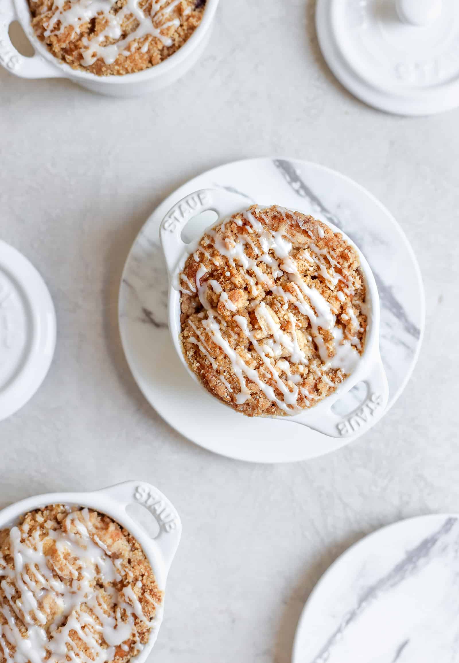 - Spray the cocottes or ramekins with non stick spray and fill them up ⅔ way full. Remove the cinnamon crumb topping from the fridge and sprinkle it all over the tops of the batter.