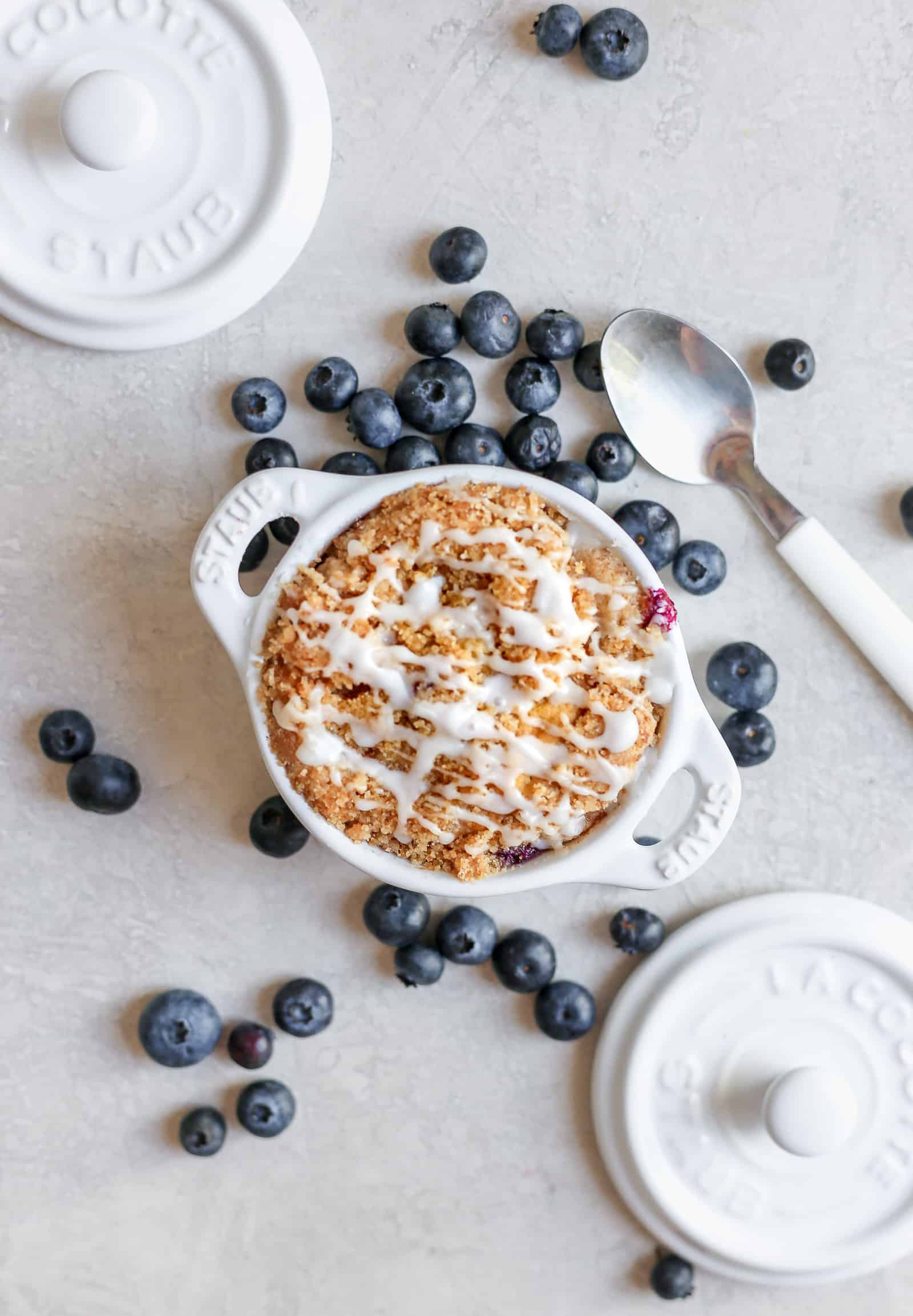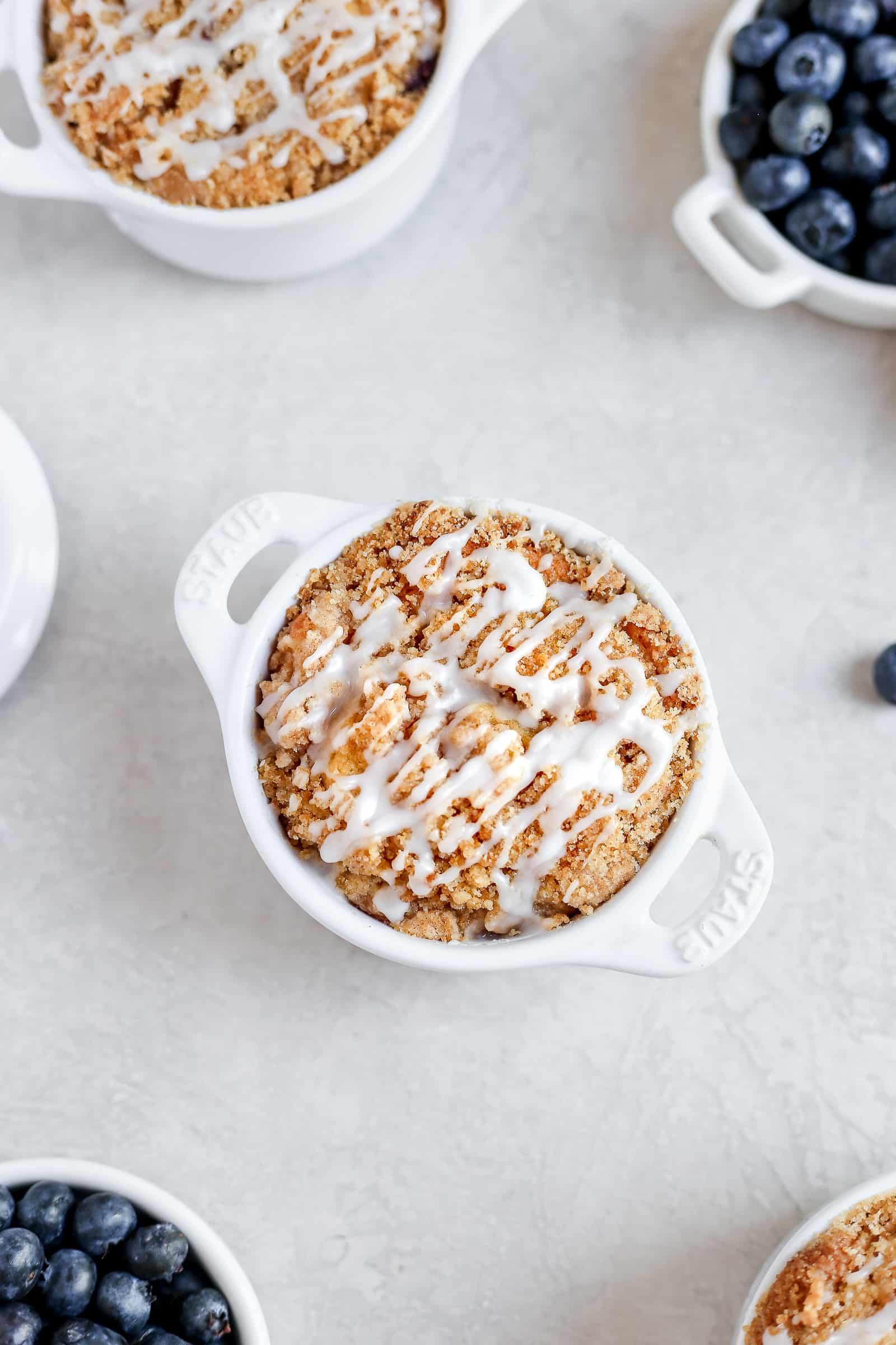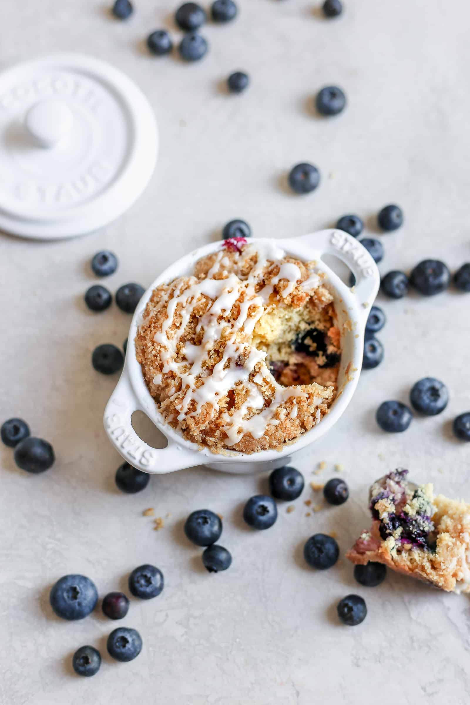 - Spray the cocottes or ramekins with non stick spray and fill them up ⅔ way full. Remove the cinnamon crumb topping from the fridge and sprinkle it all over the tops of the batter.