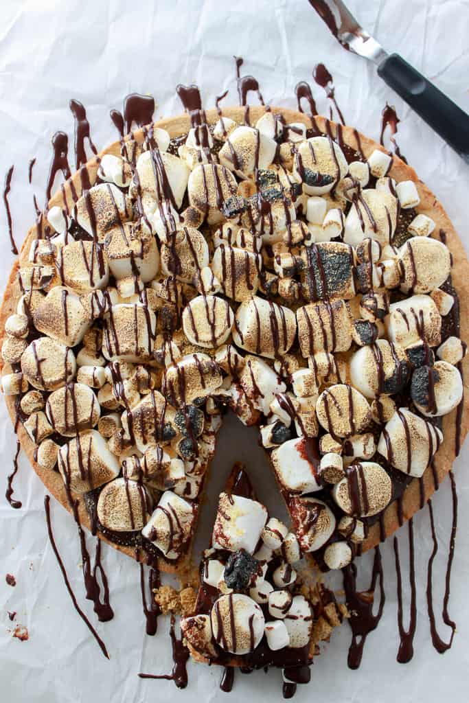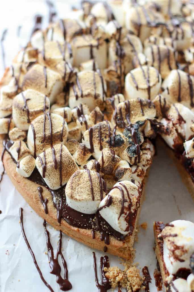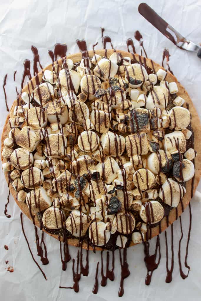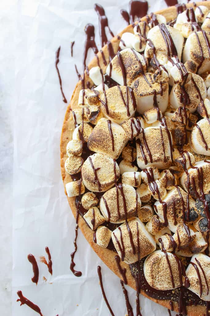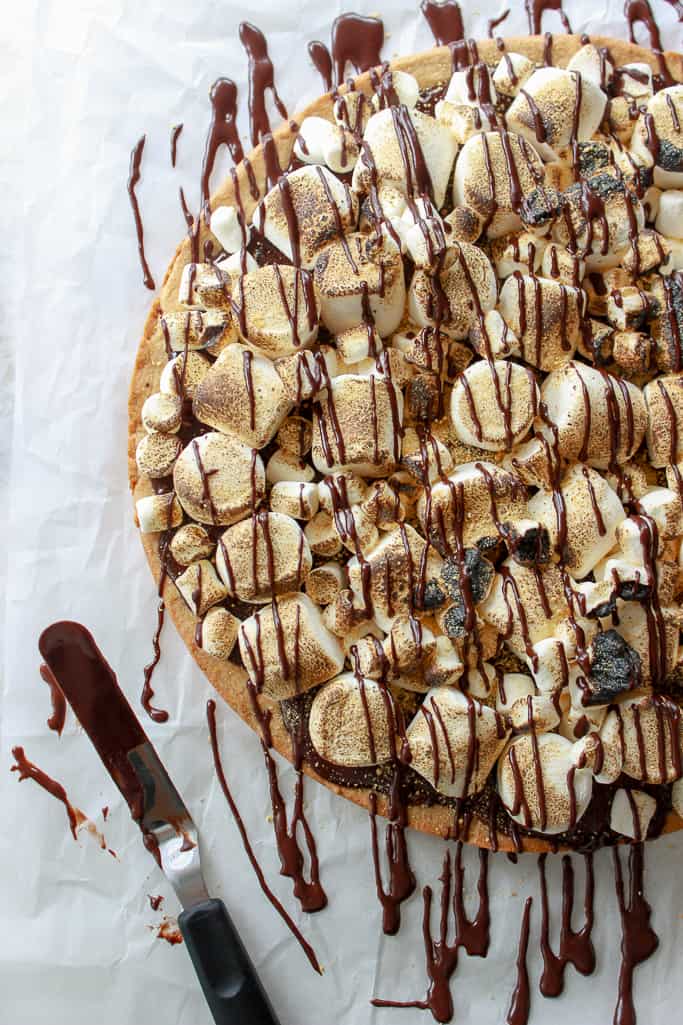 One giant graham cracker infused sugar cookie, topped with silky smooth chocolate ganache, and then loaded with marshmallows just waiting to be torched up (my favorite part). If you don’t have a torch you should totally invest in one. Relax, I don’t mean a massive blow torch, get a small one from amazon.