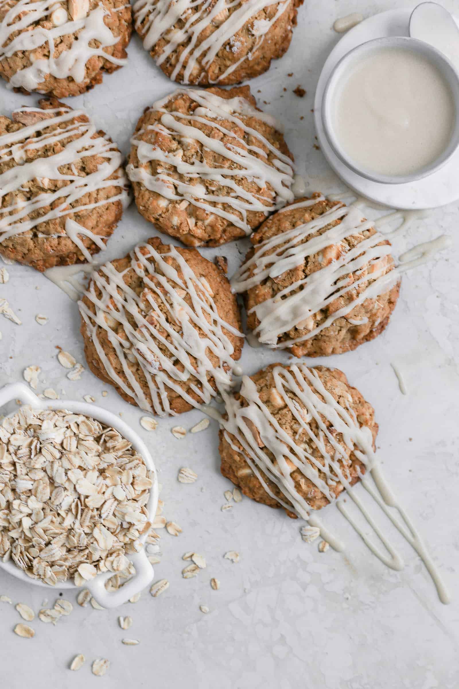 Chewy White Chocolate Oatmeal Cookies with Cream Cheese Glaze